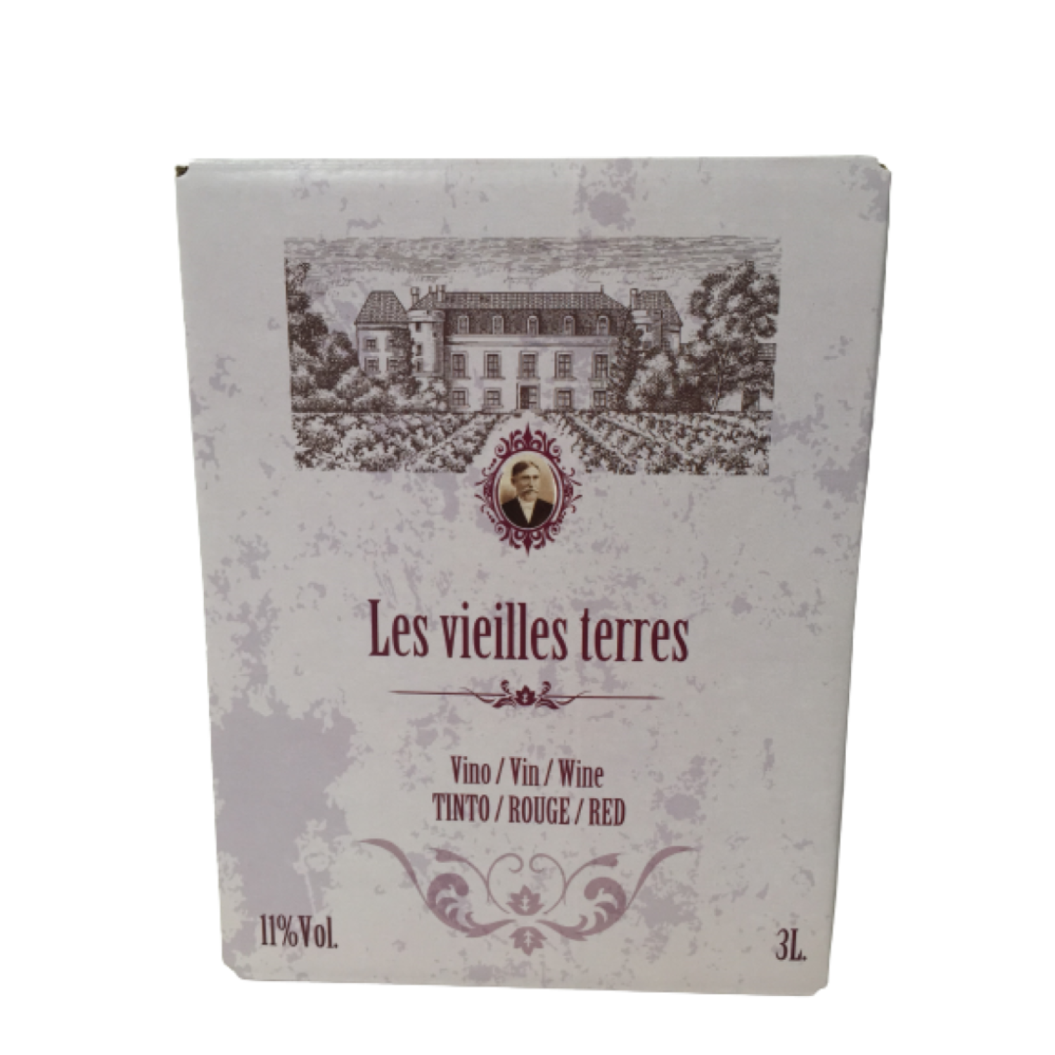 Vin rouge des Vieilles Terres, présenté en format 3 litres. Il offre des arômes de fruits rouges mûrs et d'épices douces. Souple et agréable en bouche.