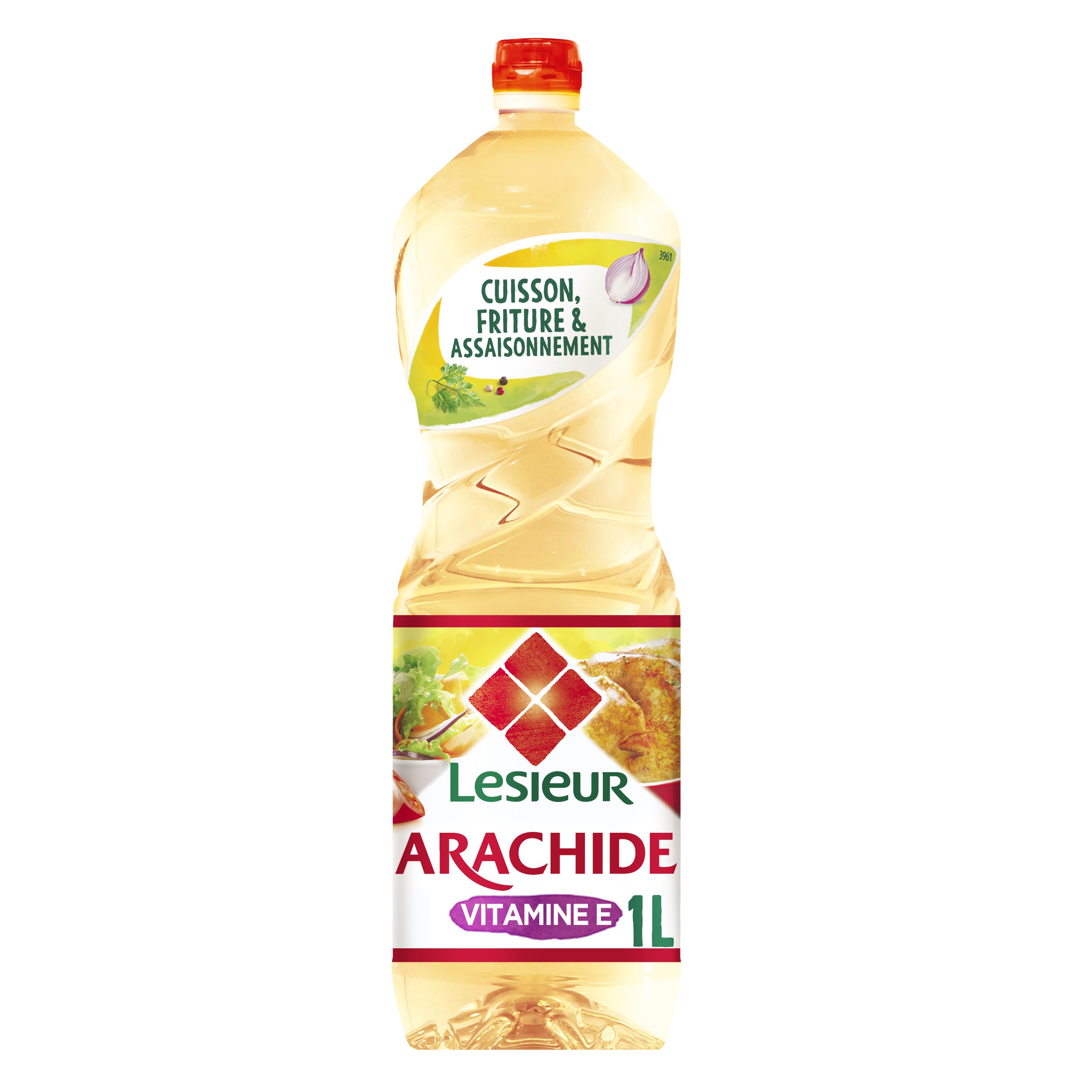 "Lesieur Arachide, l'expert de la cuisson. Grâce à sa bonne résistance à la chaleur, l'huile d'arachide est particulièrement adaptée à la cuisson vive à la poêle et en friture.* Bouteille 100% recyclée recyclable. * Température maximale conseillée: 175°"