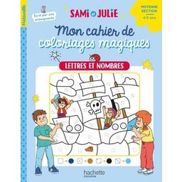 Conçu par une enseignante et conforme au programme de Moyenne Section, ce cahier de coloriages magiques accompagne votre enfant dans ses premiers apprentissages en lecture et en mathématiques, tout en développant sa motricité fine. - Au fil des 28 coloriages, il apprendra à reconnaître les lettres et les chiffres, à dénombrer des quantités, à identifier des sons, à reconnaître des formes et à se repérer dans l'espace. - Des consignes simples, un trait épais facilitant le coloriage et des thèmes captivants (pirates, animaux, chevaliers...) : tout est réuni pour favoriser l'autonomie de votre enfant et pour qu'il prenne plaisir à apprendre. Colorier avec Sami et Julie, c'est magique !