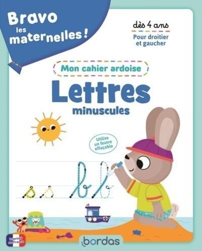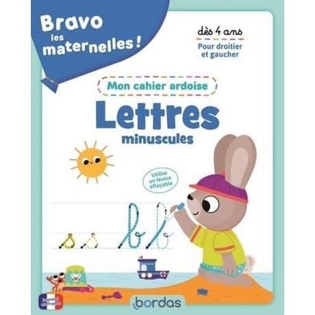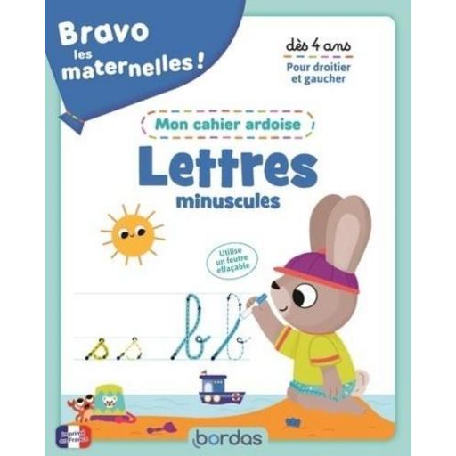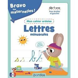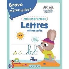 Dans la collection Bravo les Maternelles, Mon cahier ardoise Lettres minuscules permet à votre enfant d'apprendre à tracer ses premières lettres minuscules cursives dès 4 ans. Pratique et ludique, ce cahier effaçable est idéal pour apprendre en s'amusant. Votre enfant peut s'entraîner, effacer et recommencer à volonté avec son ou ses feutres effaçables. L'enfant découvre chaque lettre de l'alphabet en 4 étapes : Il repasse la lettre en grand format avec son doigt ce qui permet de mémoriser le geste, Un adulte lui lit l'histoire écrite sous la grande scène illustrée, et dans laquelle on retrouve des mots contenant la lettre étudiée mise en couleur, il s'entraîne à tracer la lettre sur différents lignages en s'aidant des modèles de tracé et des sens, il découvre un mot illustré contenant la lettre étudiée qu'il doit repasser puis compléter. Les grandes scènes illustrées et les 26 mots illustrés, dans un univers joyeux et enfantin, permettent à l'enfant de s'entraîner à tracer toutes les lettres de l'alphabet et d'enrichir son vocabulaire.