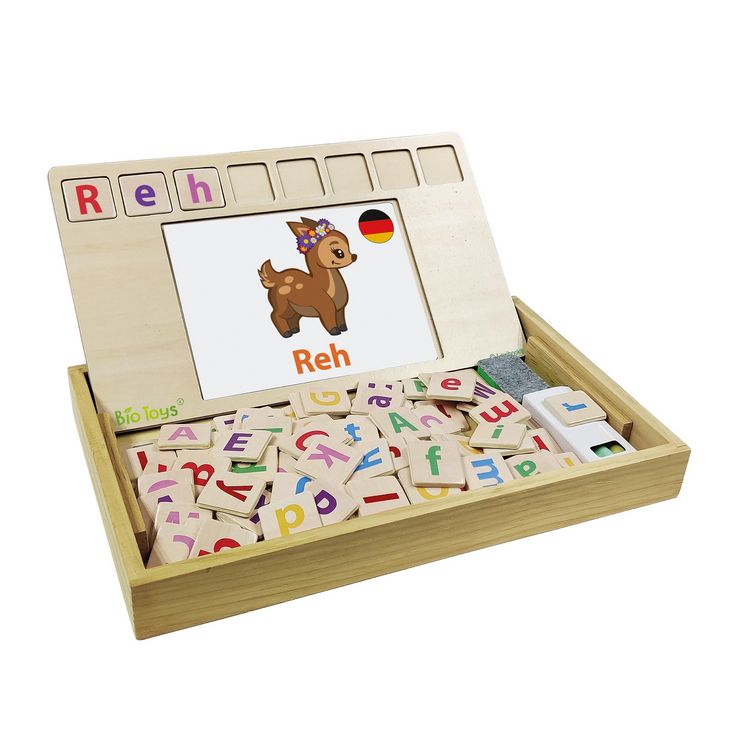 *Une boîte à activités pour découvrir les lettres, en allemand et anglais !*Set de 73 lettres en bois inclus, pour apprendre l'alphabet et reproduire les mots écrits sur les cartes fournies. *50 cartes-mots incluses pour apprendre de nouveaux mots en allemand et en anglais.*6 cartes avec des lettres