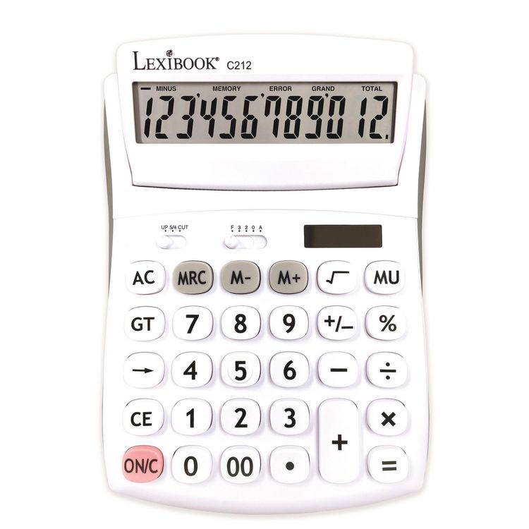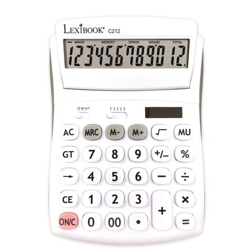 *Calculatrice à 12 chiffres avec affichage extra-large et prise en main agréable.*4 opérations + fonctions avancées (mémoire indépendante à 3 touches, pourcentage, racine carrée) + calcul de majoration. *Fonctionnalité d'arrondi et ajustement du point décimal. *Angle d'affichage réglable *Touches la