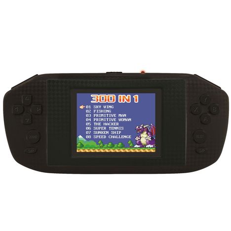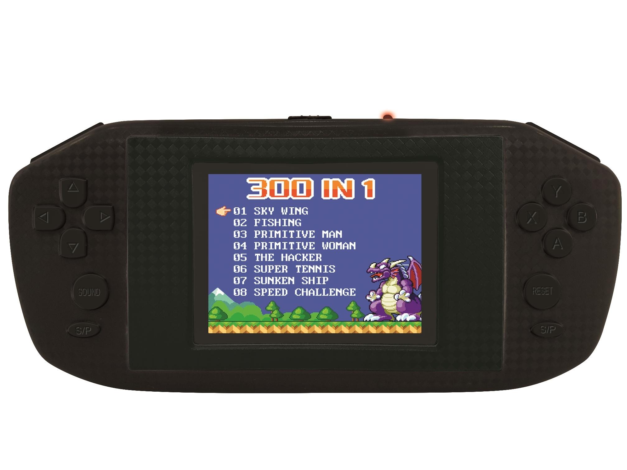 * 300-en-1 pour les fans de jeux vidéo!* Grand écran couleur LCD 2,8'' (7.1 cm) * 300 jeux inclus : jeux d'arcade (plate-forme, action...), de logique (échecs, sudoku...) et de sport (course automobile, football, golf...).* Graphismes 8 à 16-bits de haute qualité !* Format compact à emporter partout