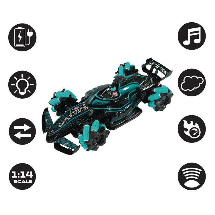 Crosslander Racing voiture télécommandée Pneus adhérents et 4 roues motrices Voiture de course lumineuse Aventure et amélioration des capacités motrices Buse : effets de fumée pour un départ de course encore plus impressionnant (une pipette est incluse pour remplir le réservoir d'eau) Fonction dérive : mouvements latéraux et diagonaux Vitesse maximale : 10 km/h / échelle 1/14 Télécommande ergonomique Effets lumineux et sonores étonnants qui confèrent du dynamisme Fréquence 2,4 GHz Mode démo Batterie rechargeable dure 20 minutes / Temps de charge : 2-3 heures (câble USB fourni) La télécommande nécessite deux piles 1,5 V AA/LR6 (non fournies), le compartiment à piles s'ouvre avec un tournevis (non fourni) Dimensions approximatives : 36 x 17 x 11 cm