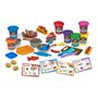 Le Kit de Pâte à Modeler Douce et Malléable Super Chef comprend 8 pots de pâte à modeler Softee Dough, 2 moules à glace, 5 moules à fruits, 1 moule à presse à fruits, 1 moule à légumes, 1 moule à poisson, 2 moules à steak, 1 moule à fromage, 1 moule à pain, 1 moule à œuf, 1 moule à galette de burger, 1 moule à biscuits, 1 moule à bretzel, 1 moule à presse à assiette, 1 moule à presse à planche à découper, 2 règles de bâtonnet de glace, 2 assiettes, 2 cuillères, 2 couteaux, 1 fourchette, 2 plateaux alimentaires, 1 poêle, un bol, 2 spatules, 1 petit couteau en plastique, 1 plateau à pizza et 2 cartes de recettes.