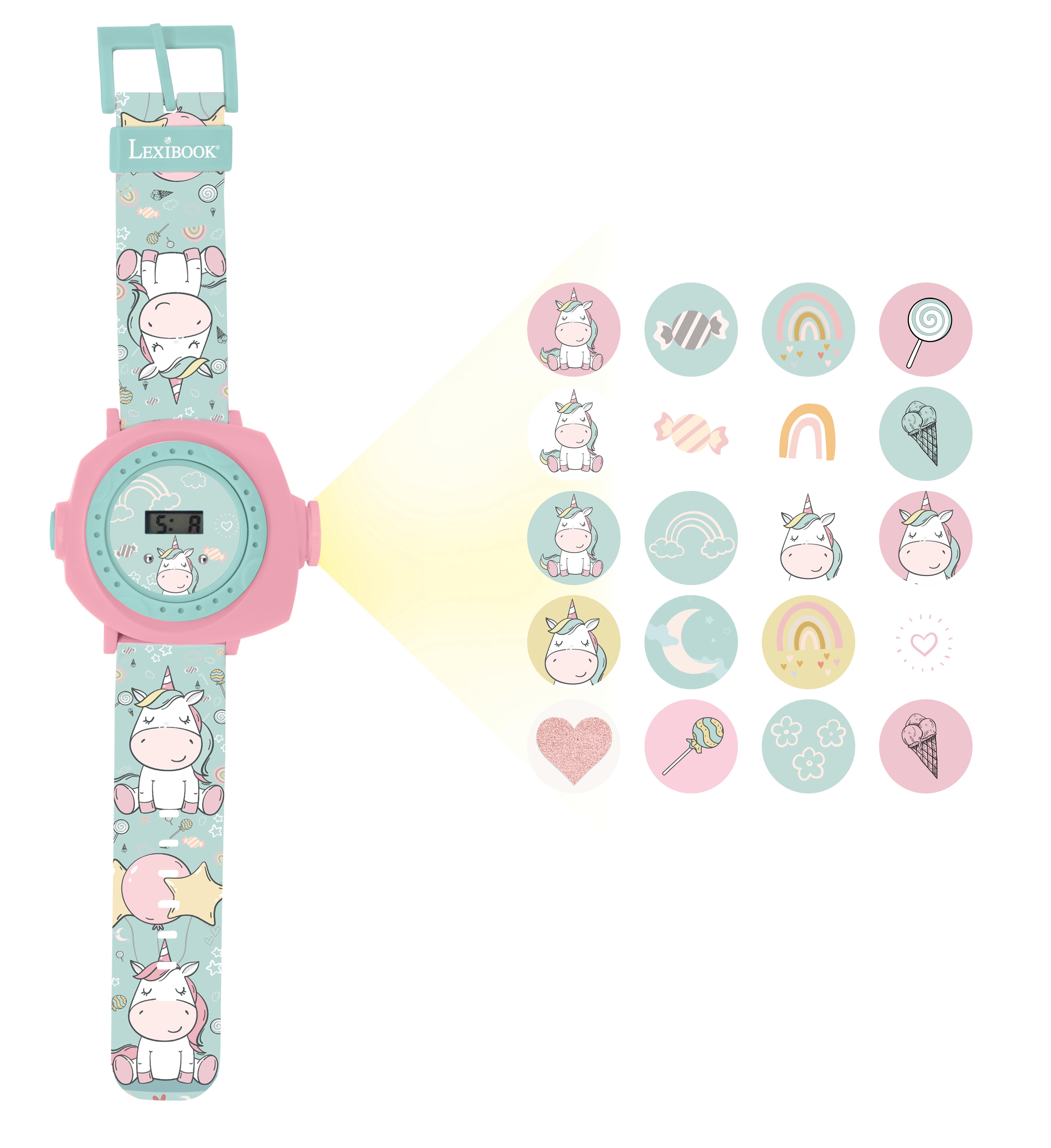 * Une montre digitale avec design Licorne !* 20 images de l'univers magique et féérique des licornes à projeter où tu veux* Communique avec tes amis en envoyant des messages codes avec tes projections préférées* Bracelet ajustable, convient parfaitement aux petits poignets* Anneau rotatif pour chois