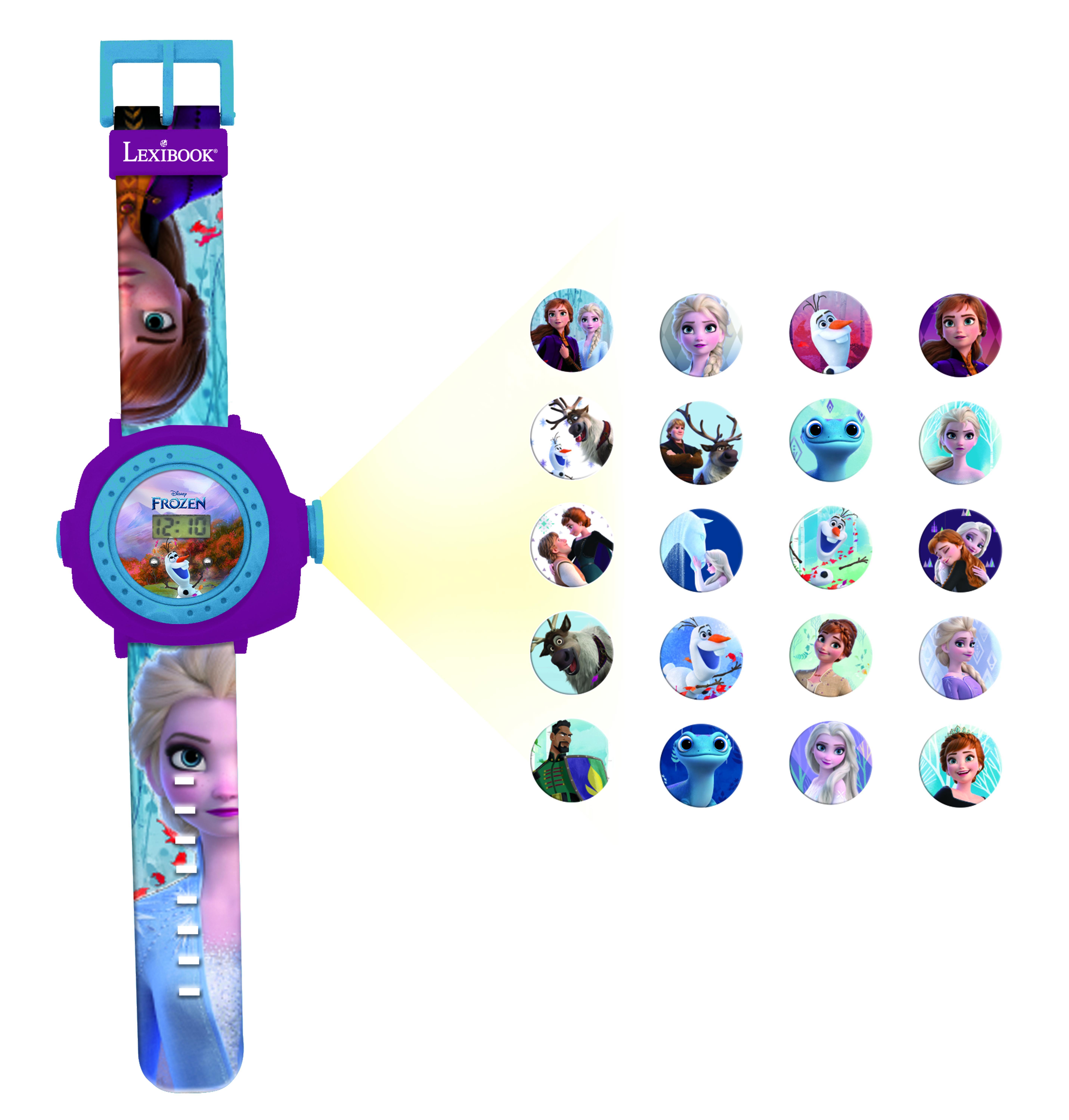 * Une montre digitale avec design La Reine des Neiges !* 20 images de l'univers d'Anna et Elsa à projeter où tu veux* Communique avec tes amis en envoyant des messages codes avec tes projections préférées* Bracelet ajustable, convient parfaitement aux petits poignets* Anneau rotatif pour choisir l'i