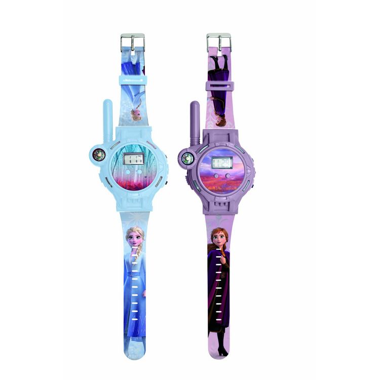 *Montre Talkies Walkies 2 en 1 La Reine des neiges : communique avec tes amis et donne l'heure. *En plus de donner l'heure, tu peux les utiliser comme talkies-walkies avec une portée approximative de 200 mètres. *Ces super horloges comprennent un bouton marche/arrêt, un microphone intégré, une bouss