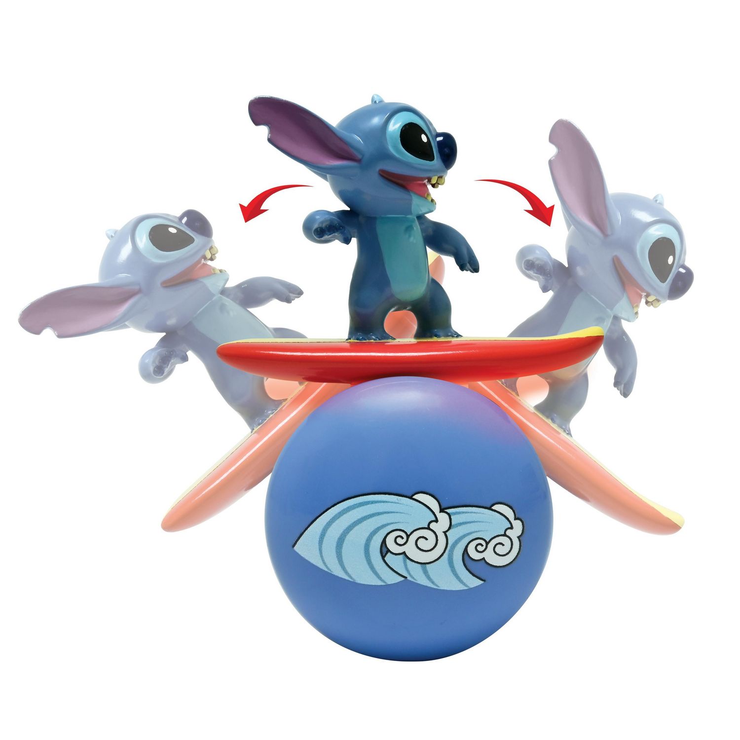- Équilibre Étonnant : Il se tient en équilibre sur une seule roue avec Stitch surfeur sur le dessus.