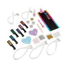 Comprend 6 craies colorées pour cheveux à appliquer directement sur les cheveux ainsi qu'un set d'extensions de cheveux qui peut être coloré et décoré avant application.