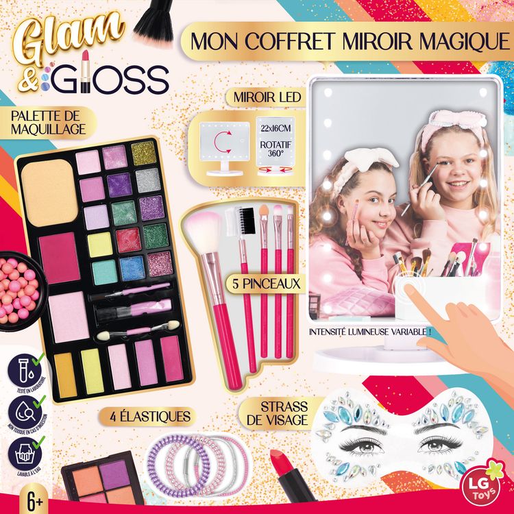 Mon coffret miroir magique : palette de maquillage, miroir led avec intensité lumineuse variable, 5 pinceaux, strass de visage, 4 élastiques
