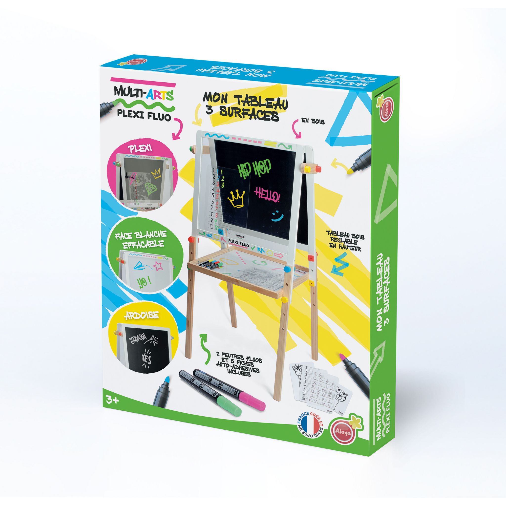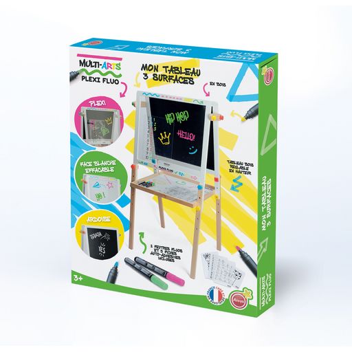 Mon tableau 3 surfaces PLEXI FLUO en bois. 1 Surface craie, 1 surface feutres effaçables et 1 surface Fluo. 2 feutres FLUOS et 5 fiches auto adhésives sont inclus. Le tableau est réglable en hauteur