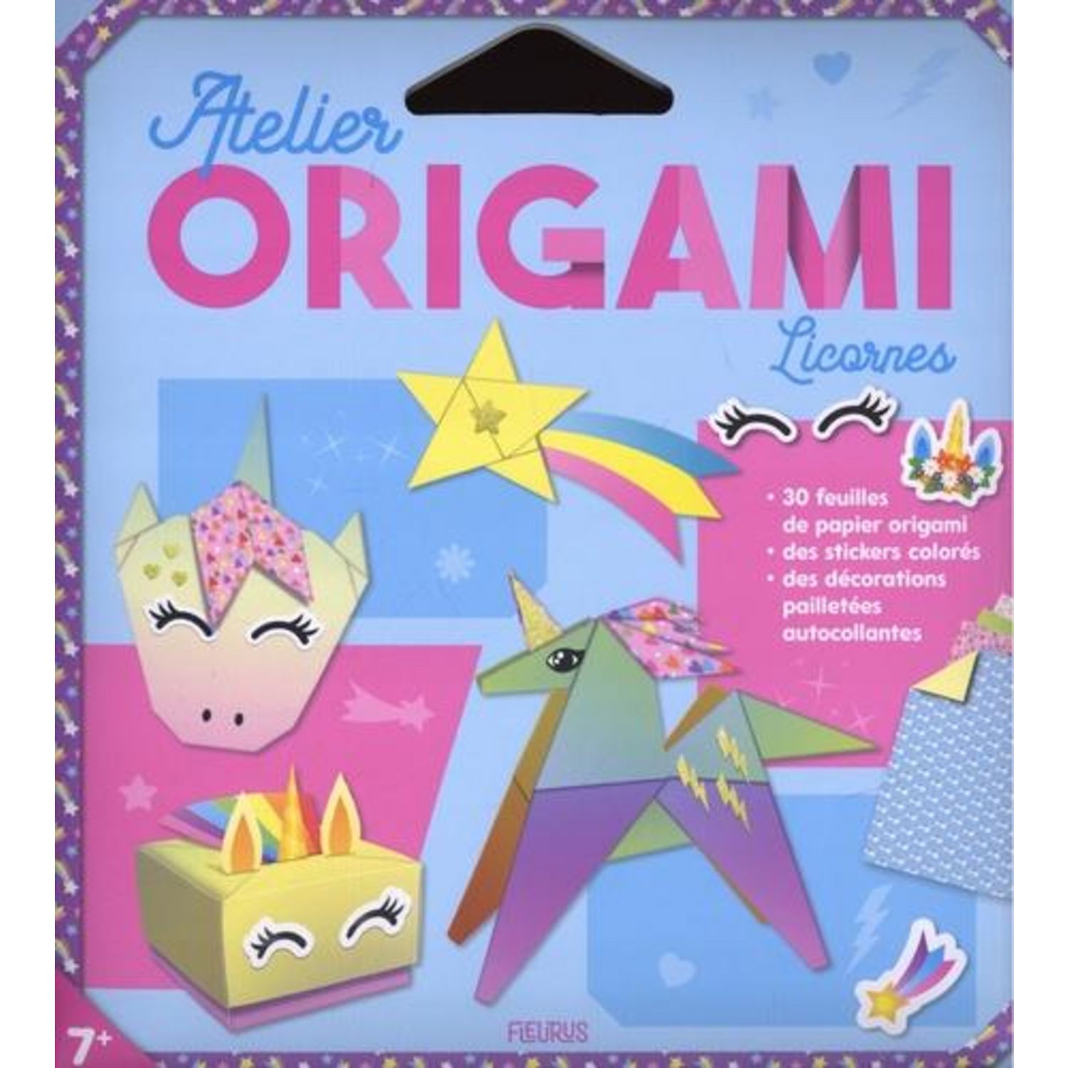 Pochette contenant 30 feuilles de papier origami imprimées de dégradés arc-en-ciel et de motifs kawaii, des stickers colorés, des stickers pailletés et un livre de modèles en pas à pas. De face, de profil, crinière au vent, boîte personnalisée, en marque-pages... Tout pour apprendre à créer des pliages de licornes trop mignons et déclinables en plusieurs versions colorées. Il ne reste plus qu'à les décorer avec les stickers !