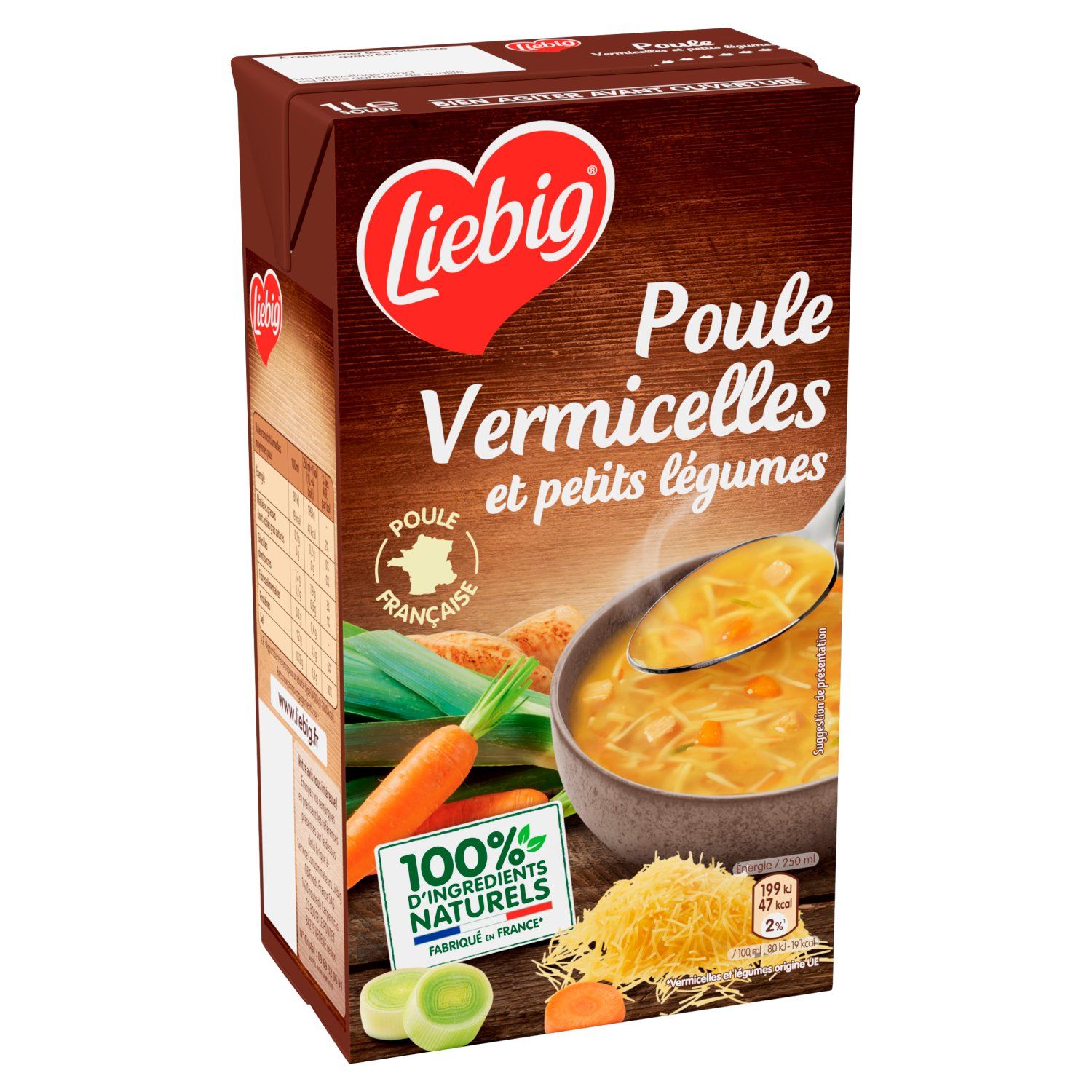 Ingrédients: eau,vermicelles cuits 10% (semoule de BLÉ (GLUTEN), blanc d'ŒUF),morceaux de viande de poule cuite et saumurée 3,0% (viande de poule, eau, amidon, sel),carotte 1,7%,amidon,poireau 0,8%,CÉLERI-RAVE,sel,arômes naturels,extrait d'oignon,arôme naturel de thym,arôme naturel de curcuma,ail,Contient 3,3% de légumes. Peut contenir des traces de lait, lupin, soja, moutarde.