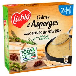 Ingrédients: eau,asperges blanches dont réhydratées 12%,pomme de terre réhydratée,oignon réhydraté,asperges vertes 3,8%,CRÈME 3,6%,amidon,morilles réhydratées 0,7%,huile de colza,sel,épinard,aromes naturels,ciboulette 0,06%. Peut contenir des traces de blé (gluten), céleri, œuf, lupin, fruits à coque, arachides, sésame, soja et moutarde.