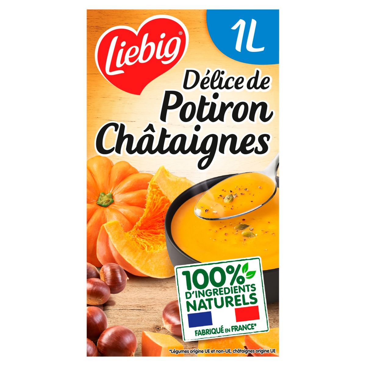 Faites vous plaisir avec les soupes gourmandes Liebig. Des recettes savoureuses pour ravir votre palais. Ces potages à la texture veloutée, avec ou sans morceaux, sont cuisinés avec amour dans notre usine en France (Légumes origine UE et non-UE) depuis 1962. Nos légumes sont sélectionnés avec soin et cueillis à maturité par nos producteurs. Pour garantir leur conservation sans aucun ajout de conservateur², nos soupes sont chauffées à haute température avant d'être mises en brique. Notre équipe qualité contrôle quotidiennement nos soupes afin de garantir les meilleurs produits. Retrouvez ces soupes en brique familiale 1L. ²Comme toutes les soupes du rayon ambiant Liebig est l'inventeur de la soupe en brique, emballage qui permet de préserver la qualité des légumes pendant plusieurs mois sans ajout de conservateur. Cette recette Liebig est fabriquée dans notre usine près d'Avignon en Provence. Nos équipes locales s'engagent à vous proposer des produits de qualité élaborés aves des légumes cultivés avec soin et récoltés à maturité. Pour plus d'informations sur notre histoire ou nos recettes, rendez-vous sur www.liebig.fr