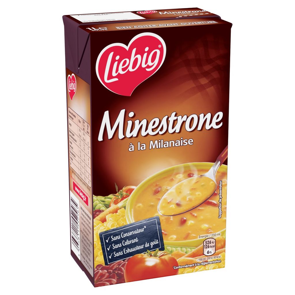 On ne dîne plus on soupe ! Simple et Gourmand : 1 bol de Minestrone à la Milanaise + 1 Œuf à la Coque et des Mouillettes Cette recette Liebig est : ✓ Sans conservateur** ✓ Sans colorant ✓ Sans exhausteur de goût ** conformément à la réglementation Découvrez un classique de la cuisine italienne dans cette association de légumes et mini pâtes qui plaira à toute la famille. Cette recette Liebig est fabriquée dans notre usine près d'Avignon en Provence. Nos équipes locales s'engagent à vous proposer des produits de qualité élaborés avec des légumes cueillis à maturité et cultivés en plein champ. Soupe minestrone à la milanaise