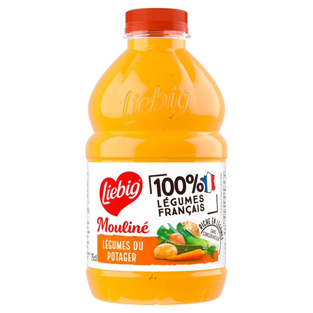 Faites vous plaisir avec les soupes en bouteilles Liebig 100% légumes français. Ces potages sont cuisinés avec 100% d'ingrédients naturels, sans conservateur² et sont sources de fibres. Velouté ou Mouliné, ces soupes ne manqueront pas de vous surprendre. Retrouvez ces soupes familiales en bouteille de 75cl. ²Comme toutes les soupes du rayon ambiant Liebig est l'inventeur de la soupe en brique, emballage qui permet de préserver la qualité des légumes pendant plusieurs mois sans ajout de conservateur. Cette recette Liebig est fabriquée dans notre usine près d'Avignon en Provence. Nos équipes locales s'engagent à vous proposer des produits de qualité élaborés aves des légumes cultivés avec soin et récoltés à maturité. Pour plus d'informations sur notre histoire ou nos recettes, rendez-vous sur www.liebig.fr
