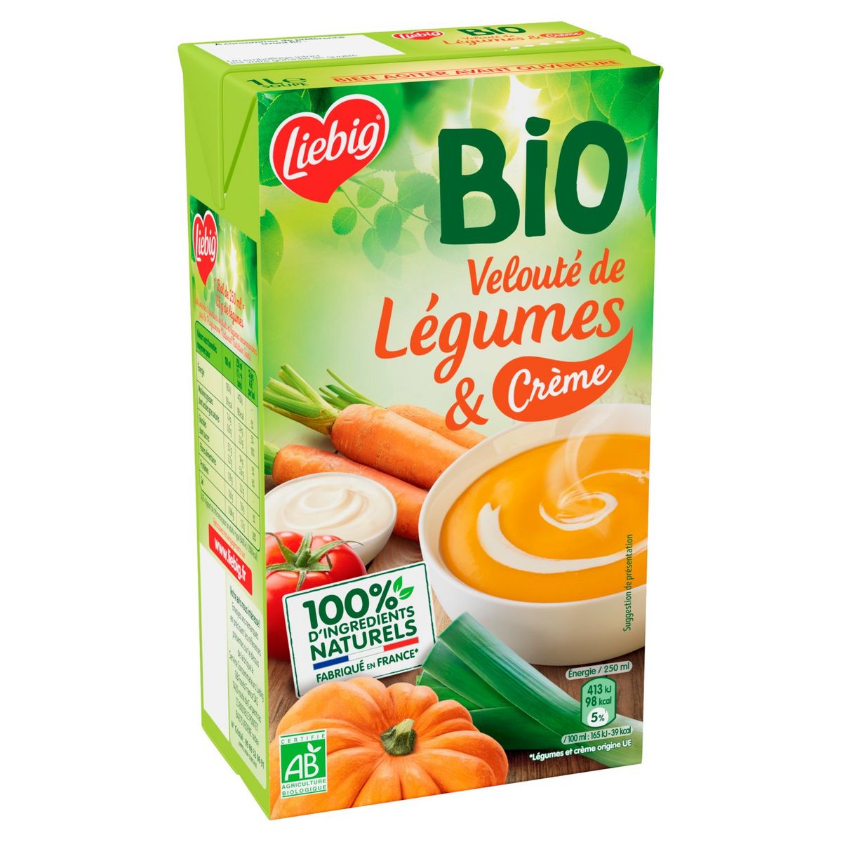 100% d'ingrédients naturels C'est quoi ? ✓ des bons légumes ✓ de l'eau ✓ des ingrédients naturels Et c'est tout ! Sans colorant² Sans conservateur Sans exhausteur de goût² Source de Fibres ²Conformément au mode de production biologique. Carottes Tomates Potiron Pommes de terre Oignons Chou-Fleur Poireaux Céleris-raves Qualité Garantie Nos légumes sont sélectionnés avec soin et cueillis à maturité. Riches de 30 ans de savoir-faire, nous les cuisinons dans notre usine près d'Avignon en Provence. Pour garantir leur conservation sans aucun ajout de conservateur, nos soupes sont chauffées à haute température avant d'être mises en brique. Notre équipe qualité contrôle quotidiennement nos soupes afin de garantir les meilleurs produits. Soupe Bio de Légumes (43%)