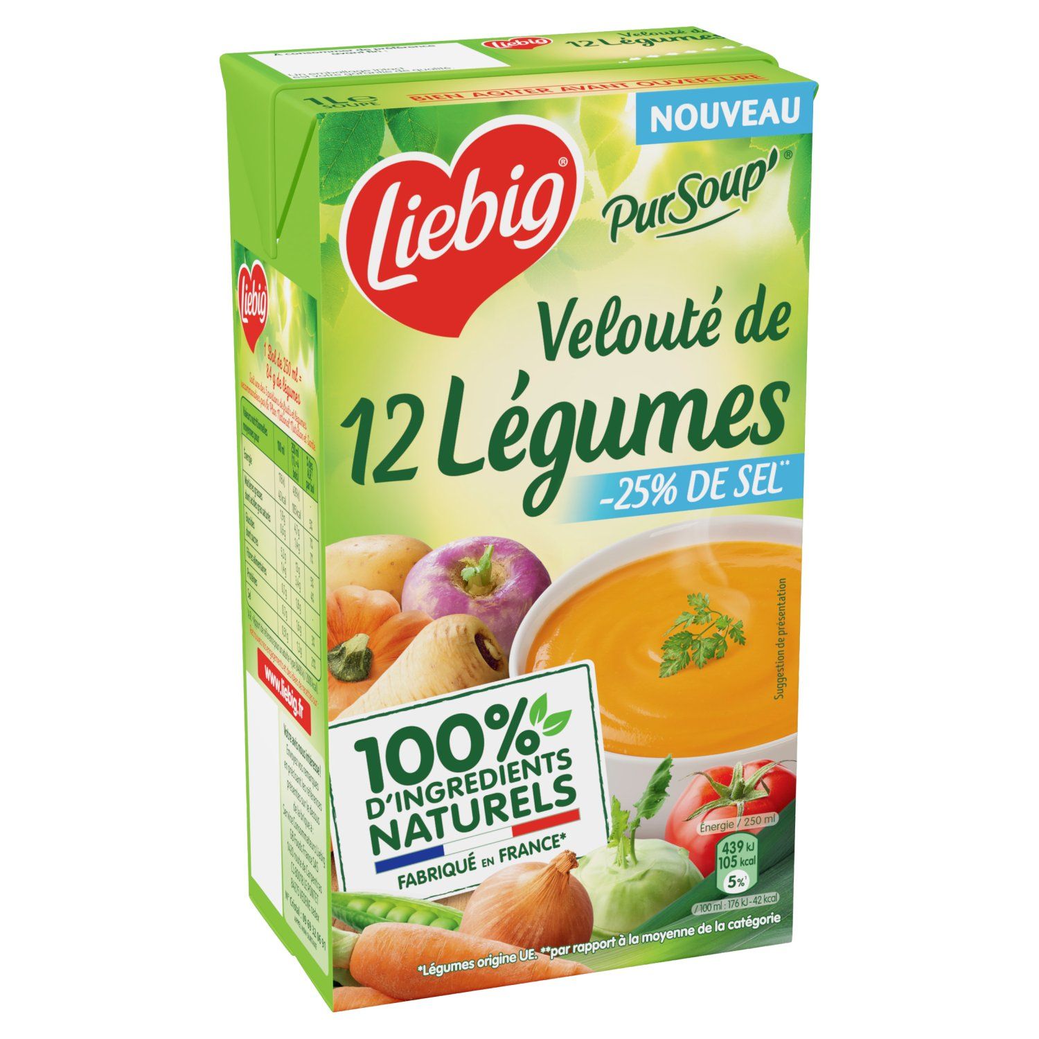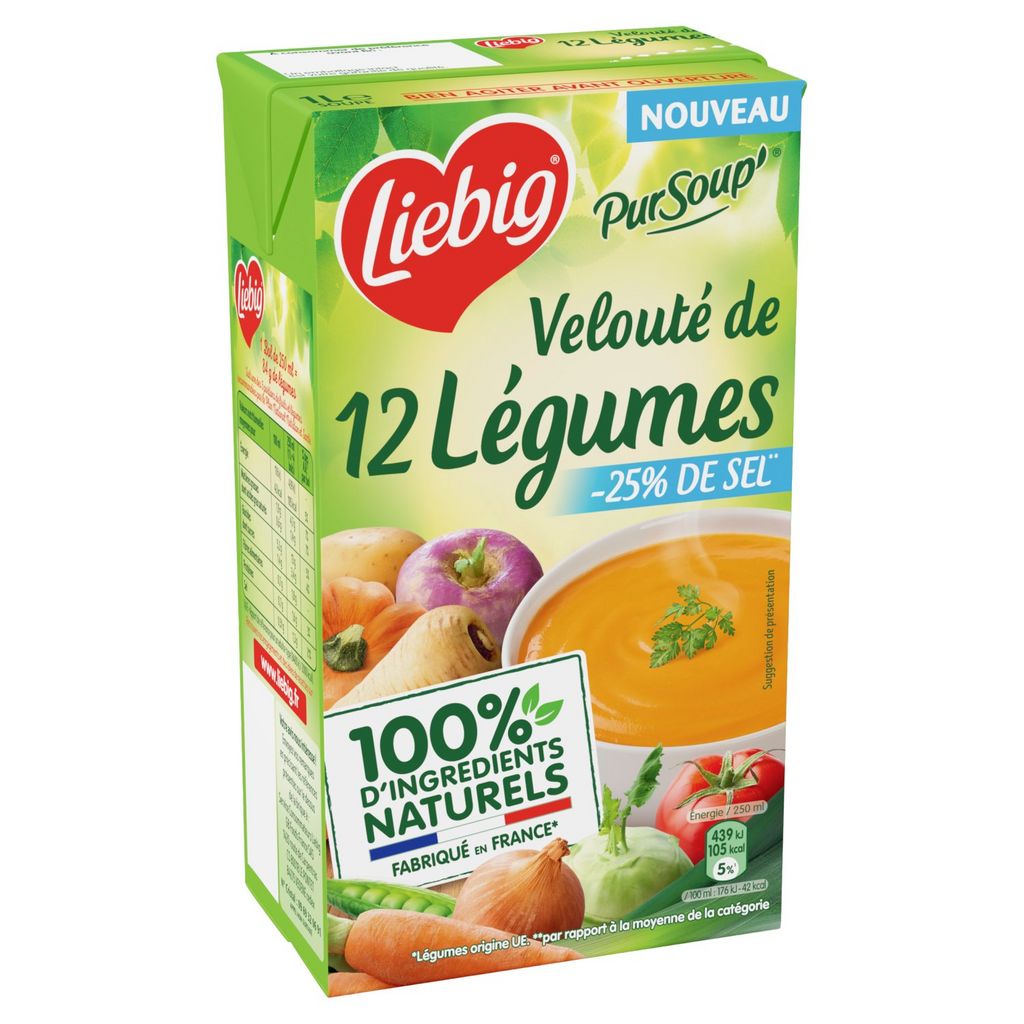Faites vous plaisir avec nos recettes de délicieuses soupes Liebig. Velouté ou Mouliné, ces potages sont cuisinés avec amour dans notre usine en France (Légumes origine UE et non-UE) depuis 1962 avec 100% d'ingrédients naturels. Nos légumes sont sélectionnés avec soin et cueillis à maturité par nos producteurs. Pour garantir leur conservation sans aucun ajout de conservateur², nos soupes sont chauffées à haute température avant d'être mises en brique. Notre équipe qualité contrôle quotidiennement nos soupes afin de garantir les meilleurs produits. Retrouvez ces soupes en brique familiale 1L. ²Comme toutes les soupes du rayon ambiant Qualité Garantie Nos légumes sont sélectionnés avec soin et cueillis à maturité. Riches de 30 ans de savoir-faire, nous les cuisinons dans notre usine près d'Avignon en Provence. Pour garantir leur conservation sans aucun ajout de conservateur, nos soupes sont chauffées à haute température avant d'être mises en brique. Notre équipe qualité contrôle quotidiennement nos soupes afin de garantir les meilleurs produits.