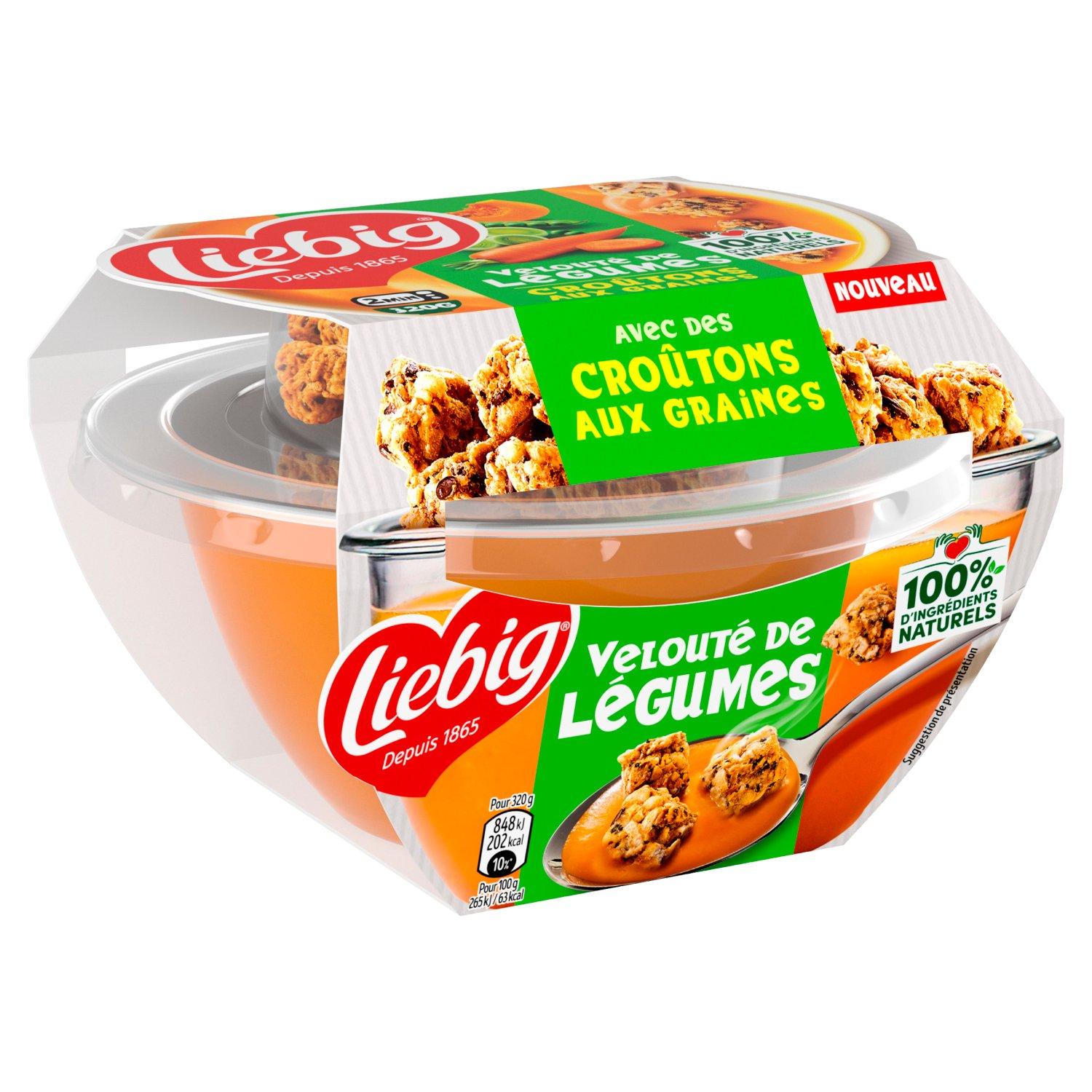 Faites vous plaisir avec nos recettes de délicieuses soupes Liebig. Velouté ou Mouliné, ces potages sont cuisinés avec amour dans notre usine en France (Légumes origine UE et non-UE) depuis 1962 avec 100% d'ingrédients naturels. Nos légumes sont sélectionnés avec soin et cueillis à maturité par nos producteurs. Pour garantir leur conservation sans aucun ajout de conservateur², nos soupes sont chauffées à haute température avant d'être mises en brique. Notre équipe qualité contrôle quotidiennement nos soupes afin de garantir les meilleurs produits. Ce nouveau format en forme de cup est idéal pour un repas seul. Le format de cup avec son granolas, ramène un côté croustillant au gourmand. 2Comme toutes les soupes du rayon ambiant