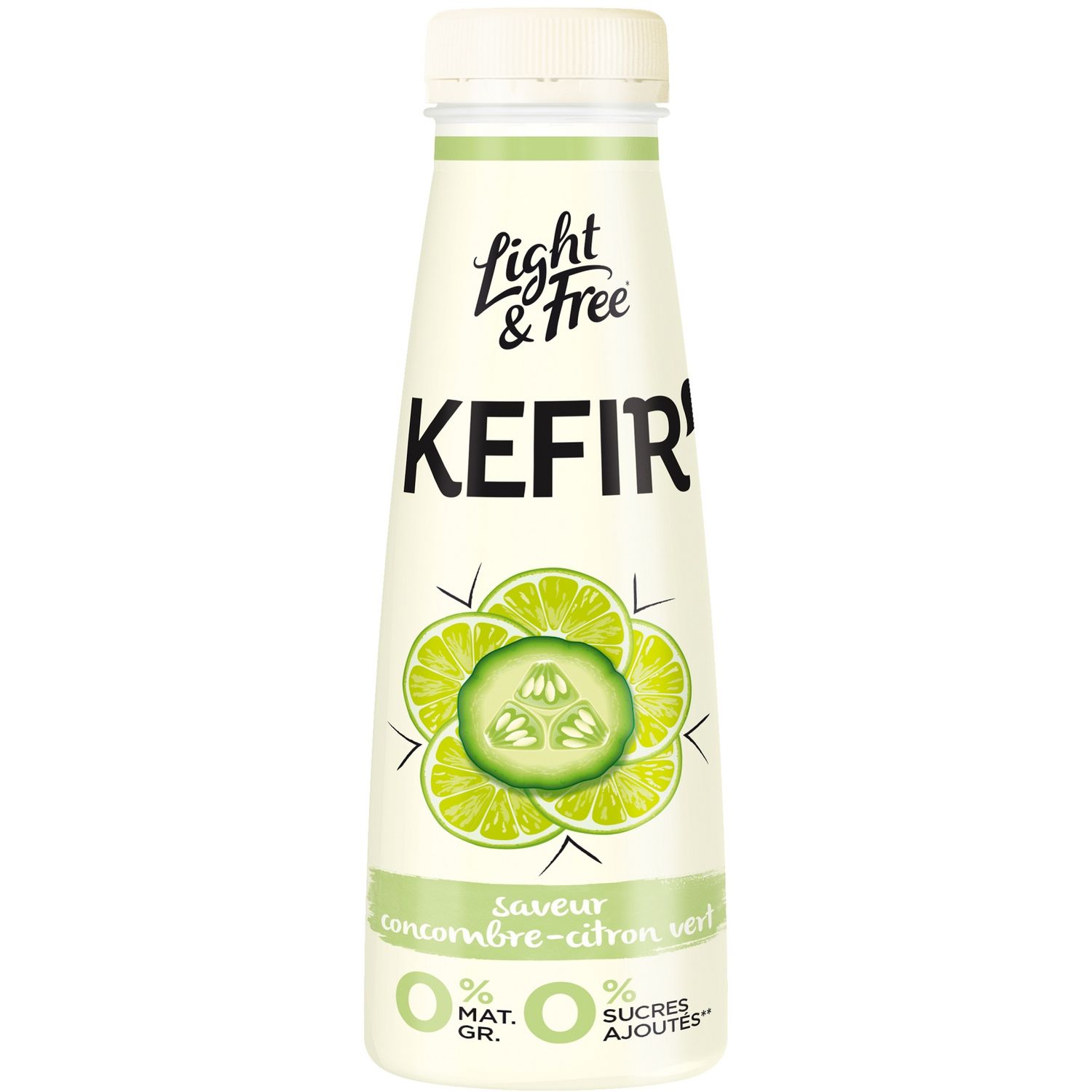 Découvrez notre surprenant Kéfir Light & Free! Une boisson ronde et acidulée saveur concombre citron vert, qui fera pétiller vos papilles ! Sans matières grasses, sans sucres ajoutés et sans édulcorants ! Lait fermenté à boire aromatisé saveur concombre-citron vert