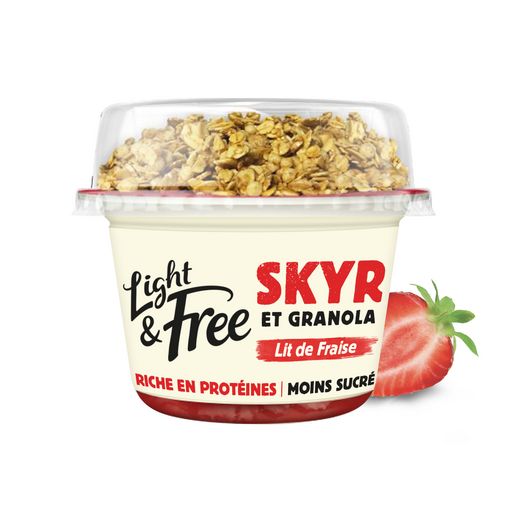 Spécialité laitière sucrée à la fraise, aromatisée, enrichie en calcium,et granola