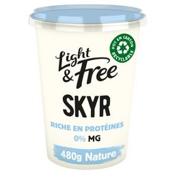 Le skyr nature Light&free est une recette inspirée d'Islande. Ce skyr a une texture ferme et onctueuse. Il est riche en protéines et avec 0% de matières grasses. Ce skyr nature est fabriqué dans notre laiterie de Ferrières-en-Bray (76) à base de bon lait français et de ferments . Avec des céréales, des fruits ou du miel, ce skyr sera votre allié pour un petit-déjeuner, un dessert ou un encas réussi. Il peut également être utilisé comme ingrédient de base pour certaines recettes sucrées ou salées. Un format en pot de 480g pour plus de plaisir!
