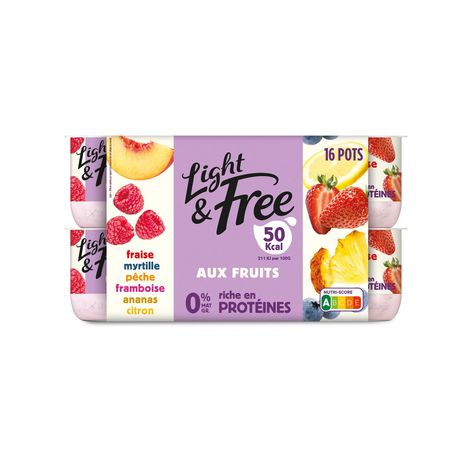 Light&Free yaourts aux fruits (fraise, myrtille, pêche, framboise, ananas, citron) est un panaché de yaourts 0% de MG, allégés*, riches en protéines et sources de vitamines D. Ils sont fabriqués dans notre laiterie de Villecomtal-sur-Arros (32) à base de lait français. Un panaché de yaourts brassés aux fruits avec une texture onctueuse pour allier plaisir et légèreté. Les yaourts aux fruits 0% MG Light&Free sont le dessert idéal! Light&Free est partenaire de Too Good To Go. Ce yaourt a désormais une DDM (date de durabilité minimale) : le produit peut donc toujours être consommé après cette date en adoptant les bons gestes ! Taillefine est devenu Light&Free ! *-30% de calories par rapport à la moyenne des produits non allégés du marché