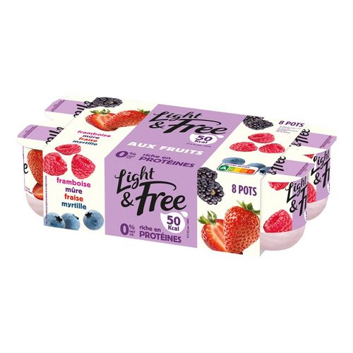 Light&Free yaourts aux fruits rouges (framboise, mûre, fraise, myrtille) est un panaché de yaourts 0% de MG, allégés*, riches en protéines et sources de vitamines D. Ils sont fabriqués dans notre laiterie de Villecomtal-sur-Arros (32) à base de lait français. Un panaché de yaourts brassés aux fruits avec une texture onctueuse pour allier plaisir et légèreté. Les yaourts aux fruits 0% MG Light&Free sont le dessert idéal! Light&Free est partenaire de Too Good To Go. Ce yaourt a désormais une DDM (date de durabilité minimale) : le produit peut donc toujours être consommé après cette date en adoptant les bons gestes ! Taillefine est devenu Light&Free ! *-30% de calories par rapport à la moyenne des produits non allégés du marché