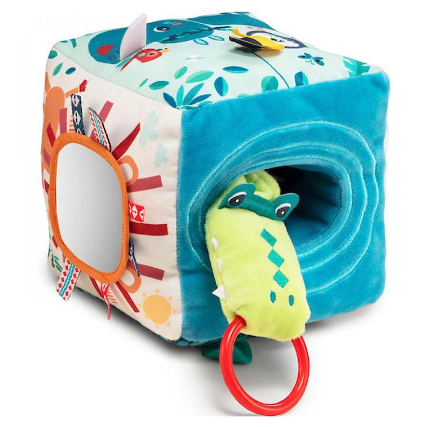 le cube sonore d'activités de la jungle de Lilliputiens, un jouet d'éveil en tissu qui aidera a stimuler votre bébé dès ses premiers mois.