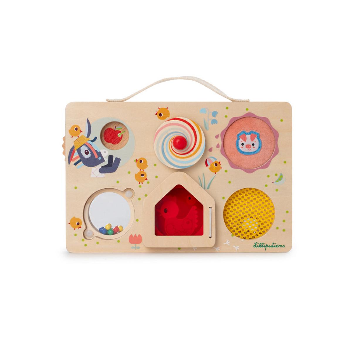 Tourner, pousser, secouer, ouvrir et observer les activités des animaux de la ferme. Que se cache-t-il dans le poulailler ?. Cette valisette pleine de petites astuces pour stimuler la motricité fine se transporte facilement.