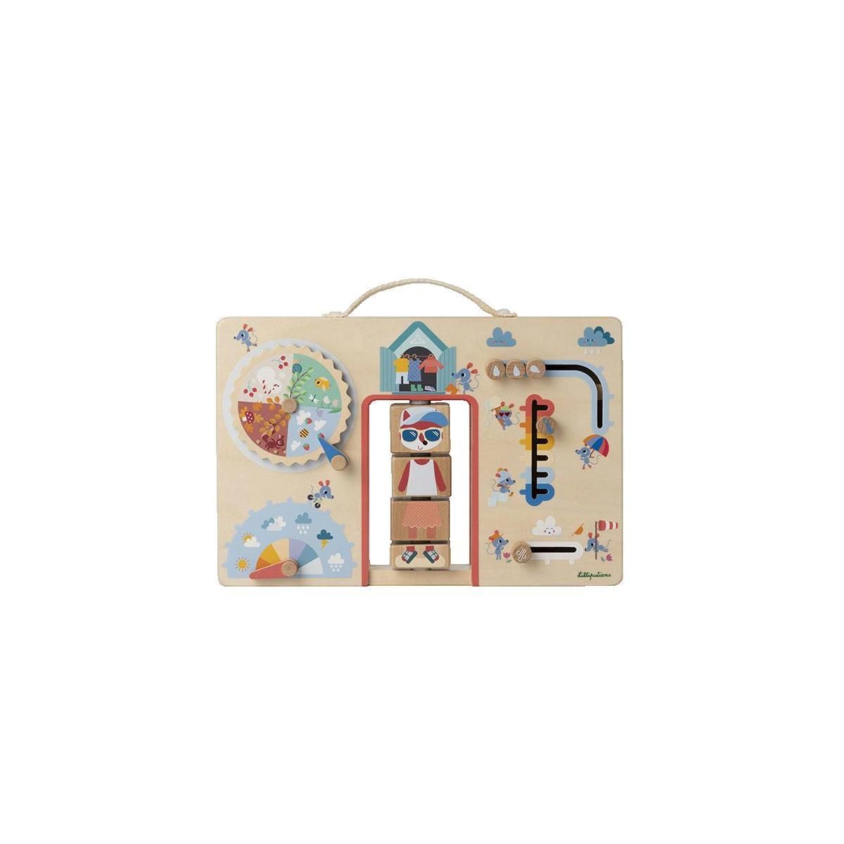 Le jeu d'éveil 'Alice s'habille selon la météo' de la marque Lilliputiens est un jouet éducatif en bois de haute qualité, conçu pour les enfants à partir de 18 mois. Il permet d'apprendre les conditions météorologiques grâce à six activités interactives, favorisant le développement cognitif et moteu