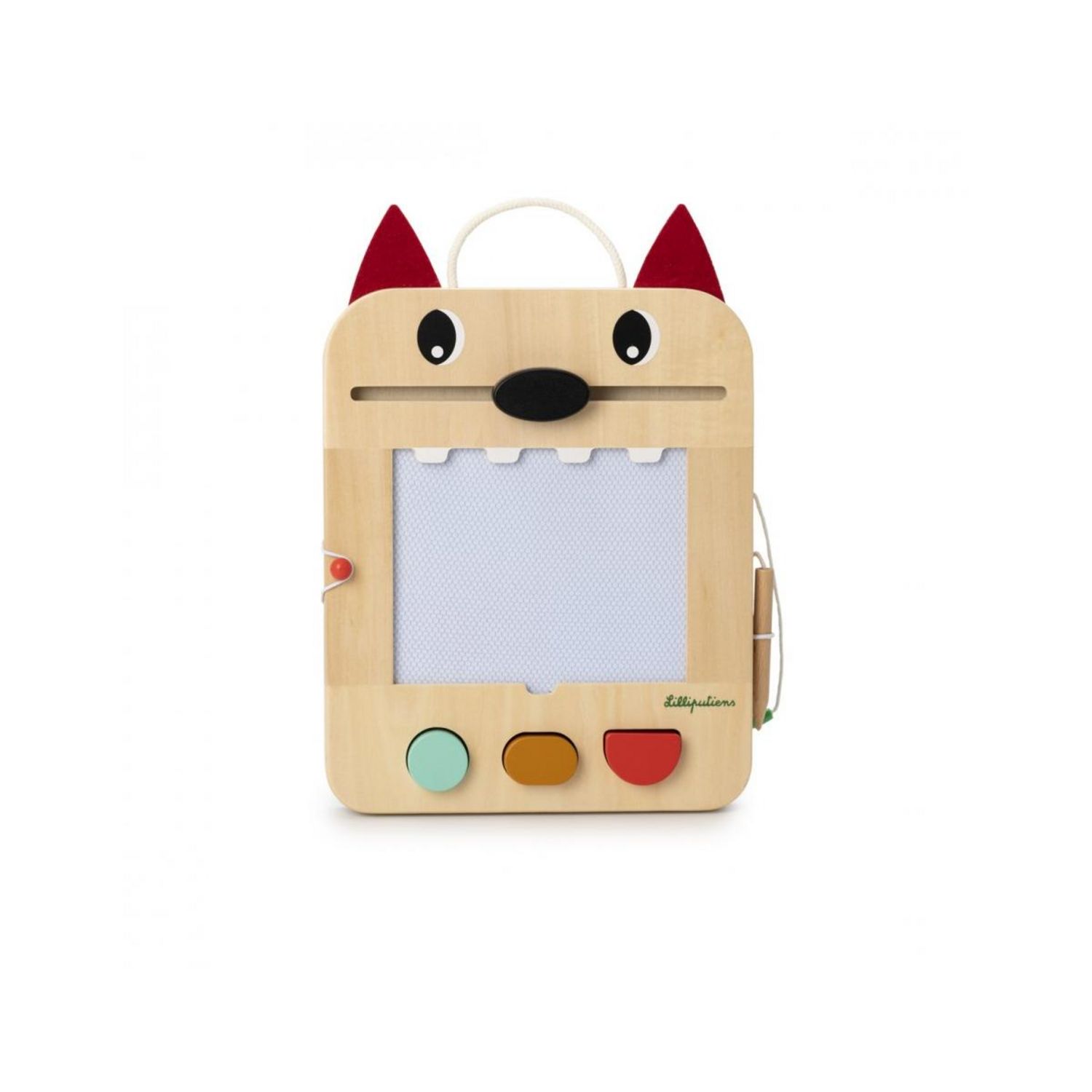 Le tableau magique de Louis le loup offre un plaisir infini de dessin et de jeu. Différentes couleurs, 3 tampons avec des formes géométriques, 6 cartes avec 12 jeux et un crayon en bois stimulent les petites mains et les esprits. Une erreur ou une envie de faire un nouveau dessin ? Alors, le museau de Louis efface le tableau. Les cartes de jeu sont rangées à l'arrière dans la fente prévue à cet effet et le crayon en bois est attaché à une corde pour ne pas le perdre.