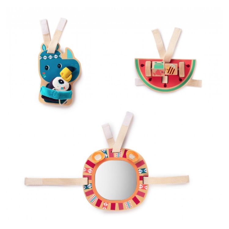 Un ensemble de 3 hochets en bois et tissus à accrocher partout (poussette, parc, lit à barreaux, transats, arches d'éveil..). Chaque hochet a une fonction : jeu de glisse, miroir, bruit de papier froissé. Matière : bois et tissus Dimension : 15x3x15 cm