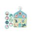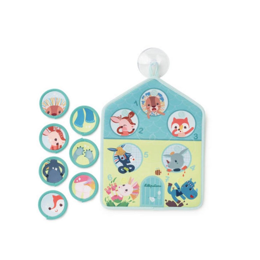 C'ets l'heure du bain ! Avec ce panneau , le rituel du bain devient un moment de plaisir et d'apprentissage ! Grâce à la ventouse, le panneau se fixe facilement sur la paroi du bain. Après une journée bien remplie, nos amis sont un peu sales mais pas de panique.. Chacun a une zone de son corps à laver. 7 pastilles qui représentent 7 parties du corps propres flottent dans l'eau du bain. L'enfant s'amusera à chercher la pastille correspondant à la partie du corps sale et la placera au bon endroit sur le panneau. Il pourra s'amuser à laver sa propre partie du corps en même temps.
