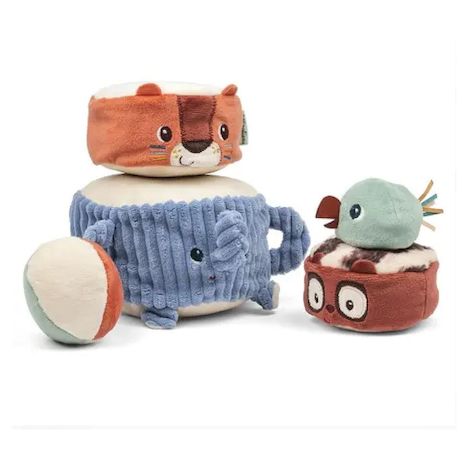 Albert l'éléphant porte fièrement ses amis de la jungle : Jack le lion, Elvis le lémurien et une perruche perchée tout en haut. Bébé les empile un à un pour construire une drôle de pyramide en tissu, et découvre à chaque étape un son différent à écouter et à manipuler. Quand la pyramide est dressée, place au défi rigolo : lancer la balle en tissu pour la faire vaciller et s'écrouler dans un éclat de rires !