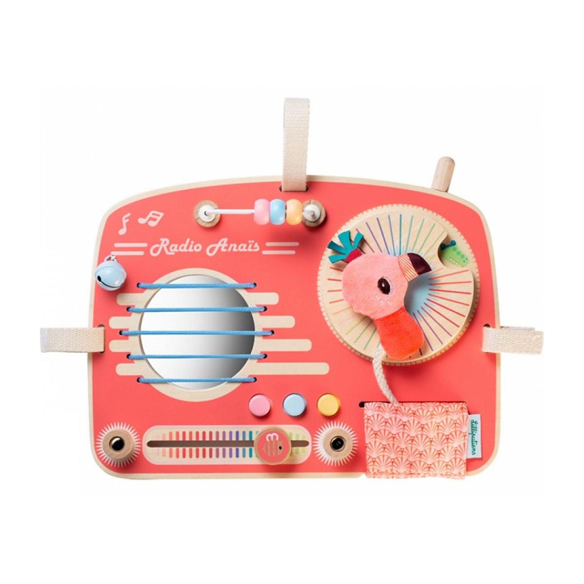 Le panneau d'activités Radio Anaïs le flamant rose de la marque Lilliputiens développe la motricité fine des tout-petits grâce aux nombreuses activités. L'enfant découvre des formes, des textures, des couleurs.. Caractéristiques techniques :. - Fixation par velcro. - Lacets. - Roulette avec animaux