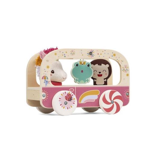 Un, deux, trois? en route ! Ce charmant bus en bois et tissu (bois FSC, détails en polyester), est conçu pour émerveiller les tout-petits dès 10 mois. À chaque poussée, les roues génèrent des effets visuels étonnants, tandis qu'à l'intérieur, les personnages?Léon le hérisson qui pivote, une grenouille qui se balance? et bien sûr Léna la licorne, prête à descendre et explorer le monde