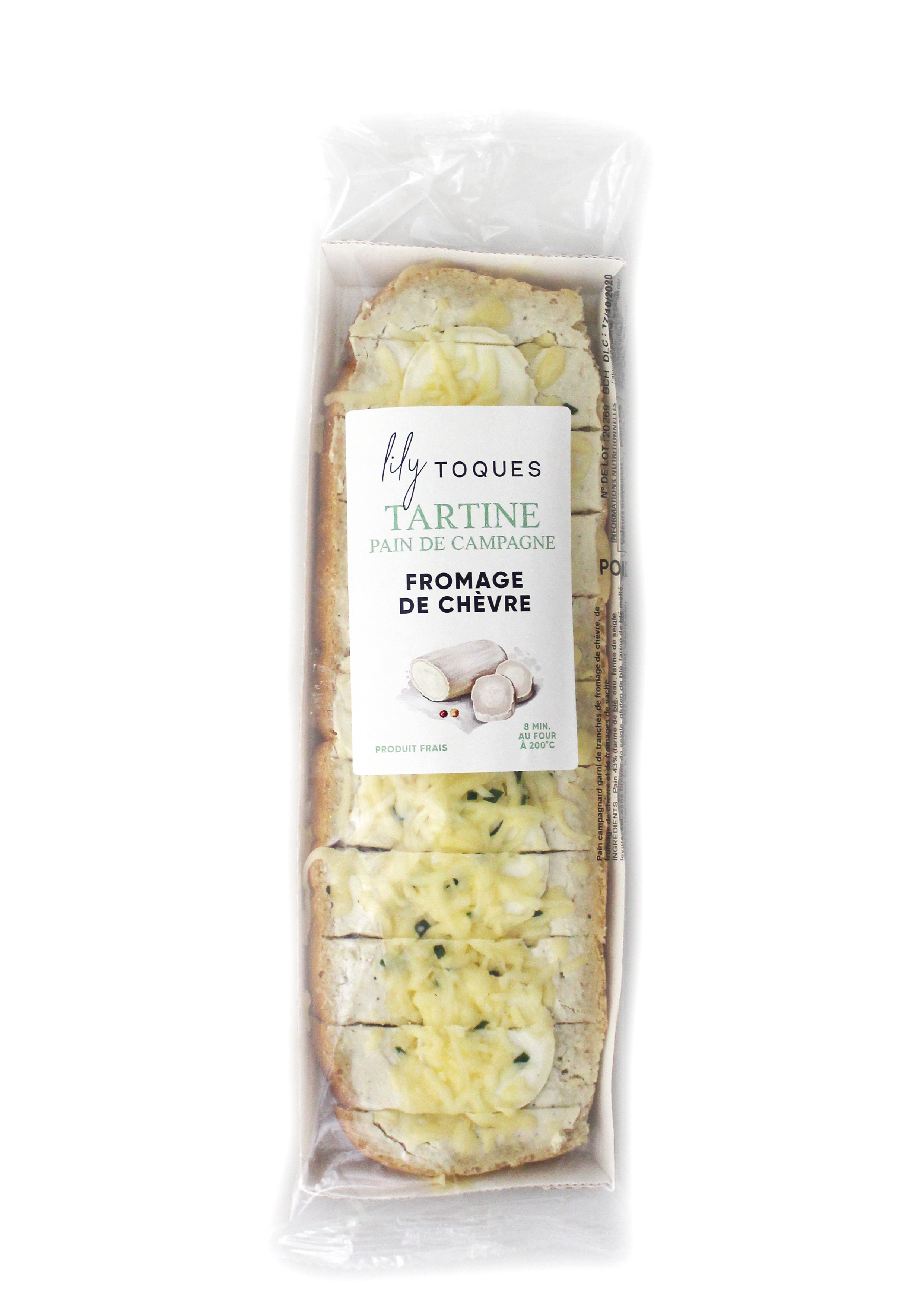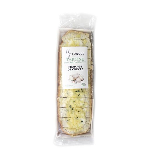 Pain de campagne garni d'une préparation et de tranches de fromage de chèvre