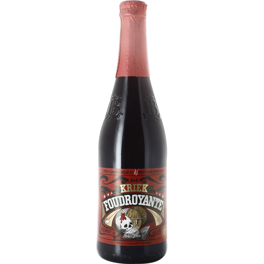 FOUDROYANTE KRIEK 75CL Cette Kriek filtrée est fabriquée à base de Lambic. La différence se situe toutefois dans l’ajout de 25% de jus de cerise pur, avant que la bière ne soit filtrée et pasteurisée. En bouche, elle est délicieusement fruitée avec une saveur de cerises fraichement cueillies et une saveur vive et corsé, passant à un équilibre parfait de douceur et d’acidité.