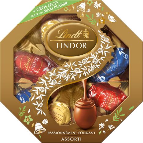 Pour les fêtes de Pâques, retrouvez les œufs LINDOR dans un nouveau format inédit encore plus généreux (18g) pour faire fondre de bonheur les plus gourmands. Des œufs deux fois plus gros, fourrés d'un cœur passionnément fondant, dans une boîte cadeau idéale à offrir ! Une boite festive et printanière avec un assortiment d'œufs moyens LINDOR Lait, Noir 45% et Blanc.