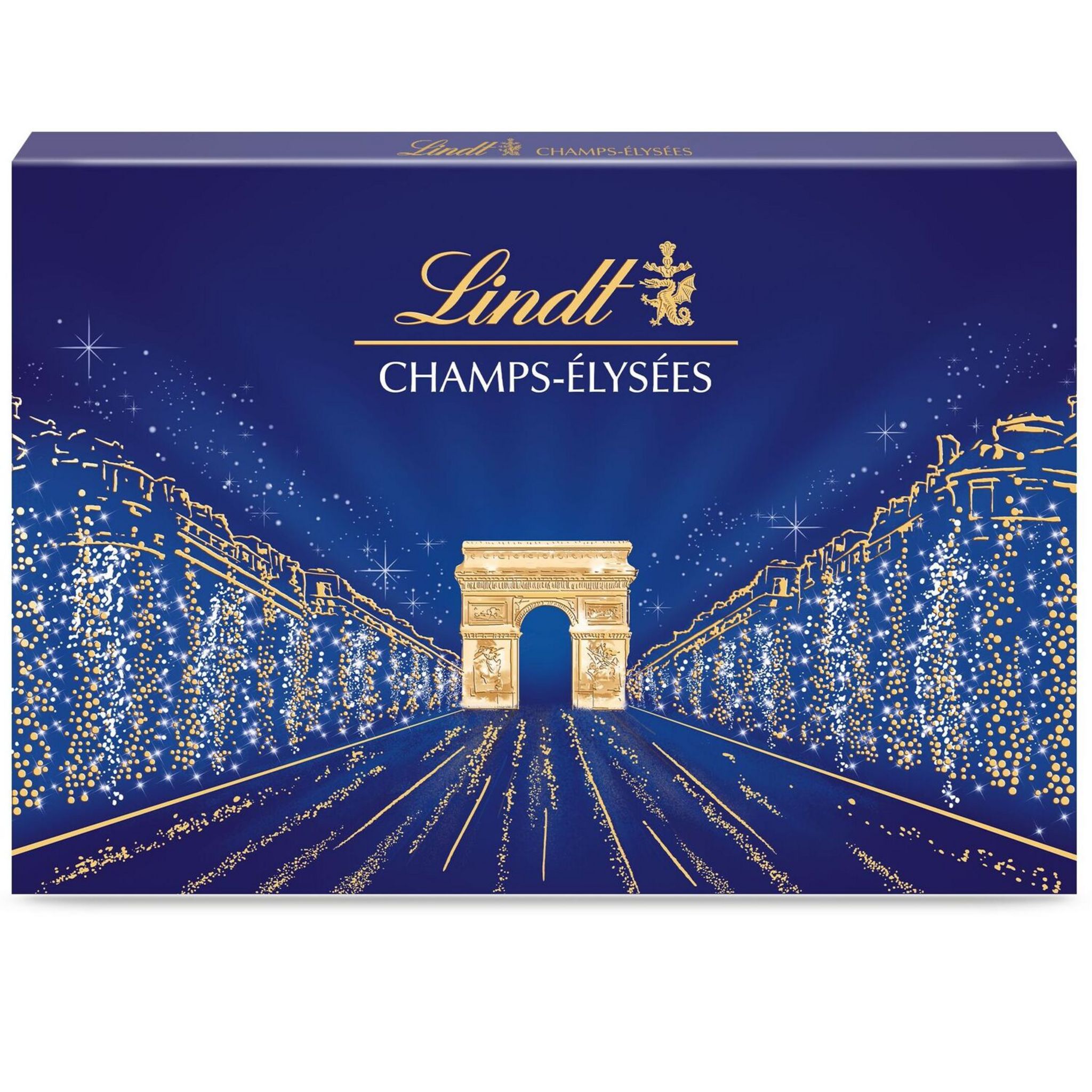 Lindt Champs-Élysées Assorti, un assortiment de 44 fines bouchées pralinées Lindt au lait, noirs et blancs.