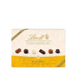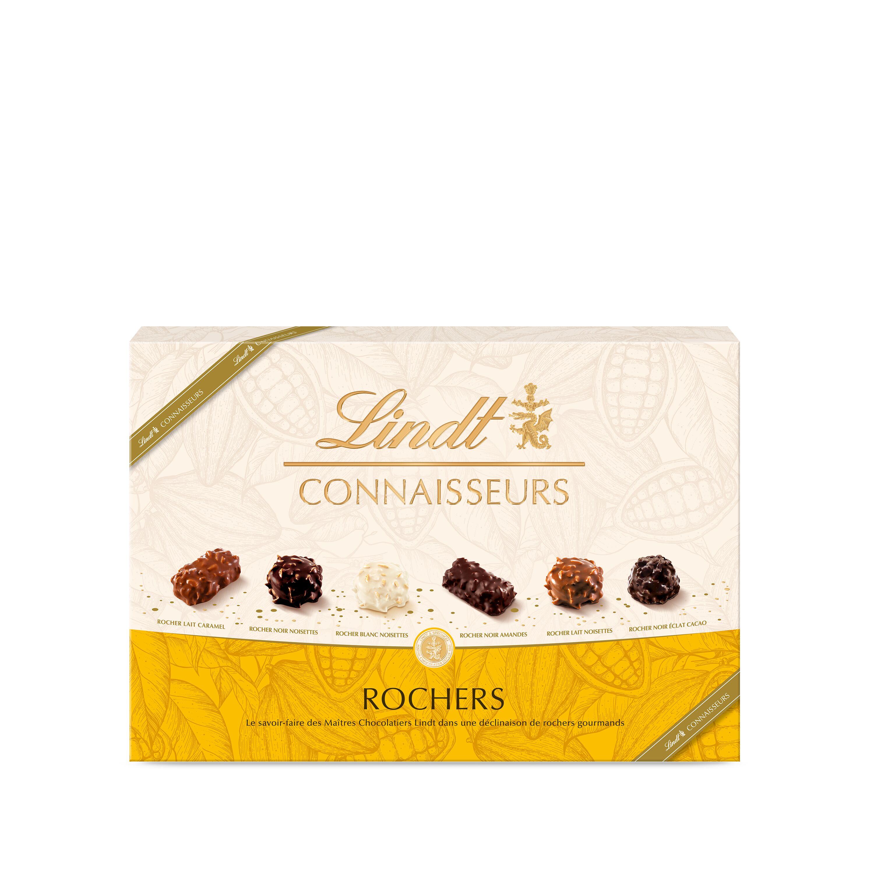 Lindt CONNAISSEURS Rochers 367g est un assortiment de rochers gourmands et croquants, créé par les Maîtres Chocolatiers Lindt dans le respect de la tradition chocolatière. À travers leur savoir-faire, découvrez 30 bouchées gourmandes, sublimant les célèbres recettes de rochers: 3 bouchées Rocher Lait Caramel, 3 bouchées Rocher Noir Amandes, 4 bouchées Rocher Lait Noisettes, 4 bouchées Rocher Noir Éclat Cacao, 8 bouchées Rocher Blanc Noisettes, 8 bouchées Rocher Noir Noisettes