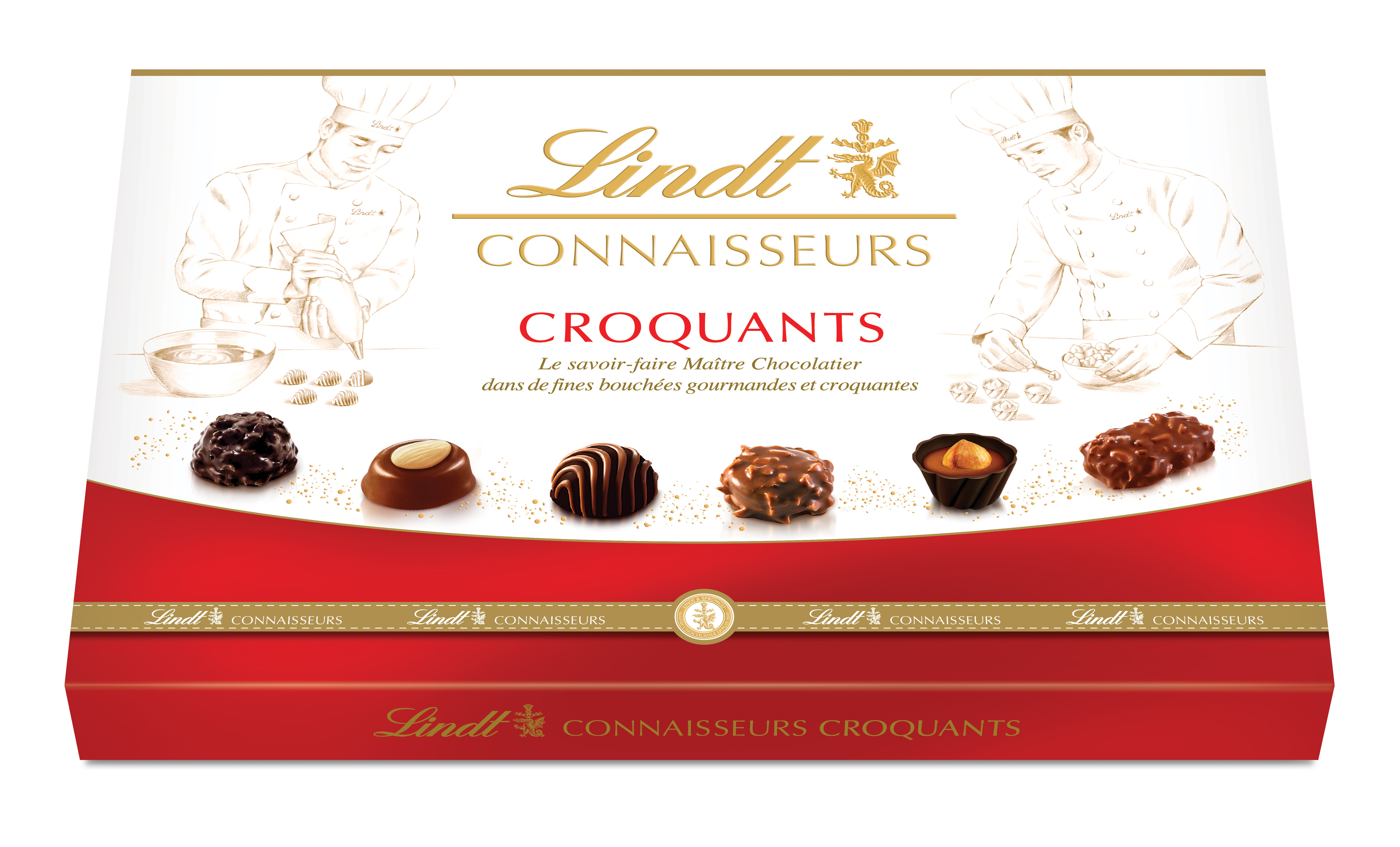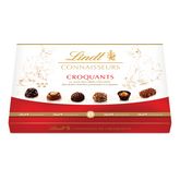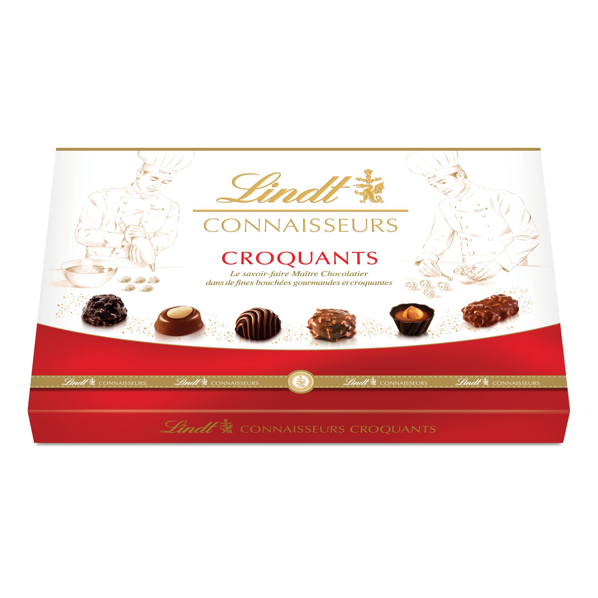 Assortiment de 37 bouchées de chocolats extra fins, au lait, noirs et blancs, fourrés Lindt Connaisseurs Croquants est un assortiment de fines bouchées de chocolat célébrant le croquant sous toutes ses formes. Nos Maîtres Chocolatiers ont préparé dans le plus pur respect de la tradition chocolatière des chocolats aux saveurs gourmandes et aux textures délicieusement croquantes, à base de noisettes entières, d'éclats croustillants, d'éclats d'amandes torréfiés.