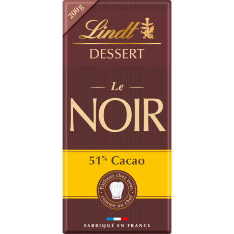 Lindt DESSERT, le chocolat idéal pour pâtisser comme un chef. L'Incontournable : le fondant exceptionnel d'un chocolat noir à 51% de cacao, idéal pour réaliser des desserts gourmands. Cette tablette se distingue du 70% par sa douceur. Vous apprécierez son goût cacaoté léger mais bien chocolaté et ses notes vanillées et sucrées. Pour des desserts à vous faire fondre de plaisir.