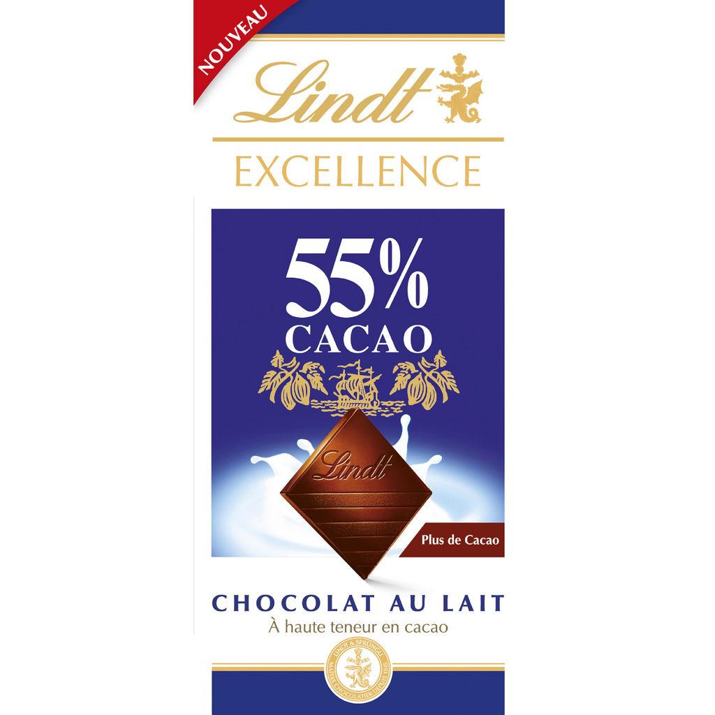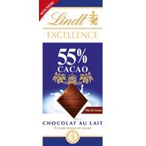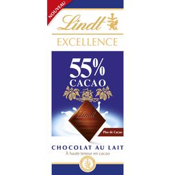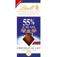 Découvrez Lindt EXCELLENCE Lait 55% cacao : la douceur d'un chocolat au lait fondant alliée aux délicates saveurs du cacao.