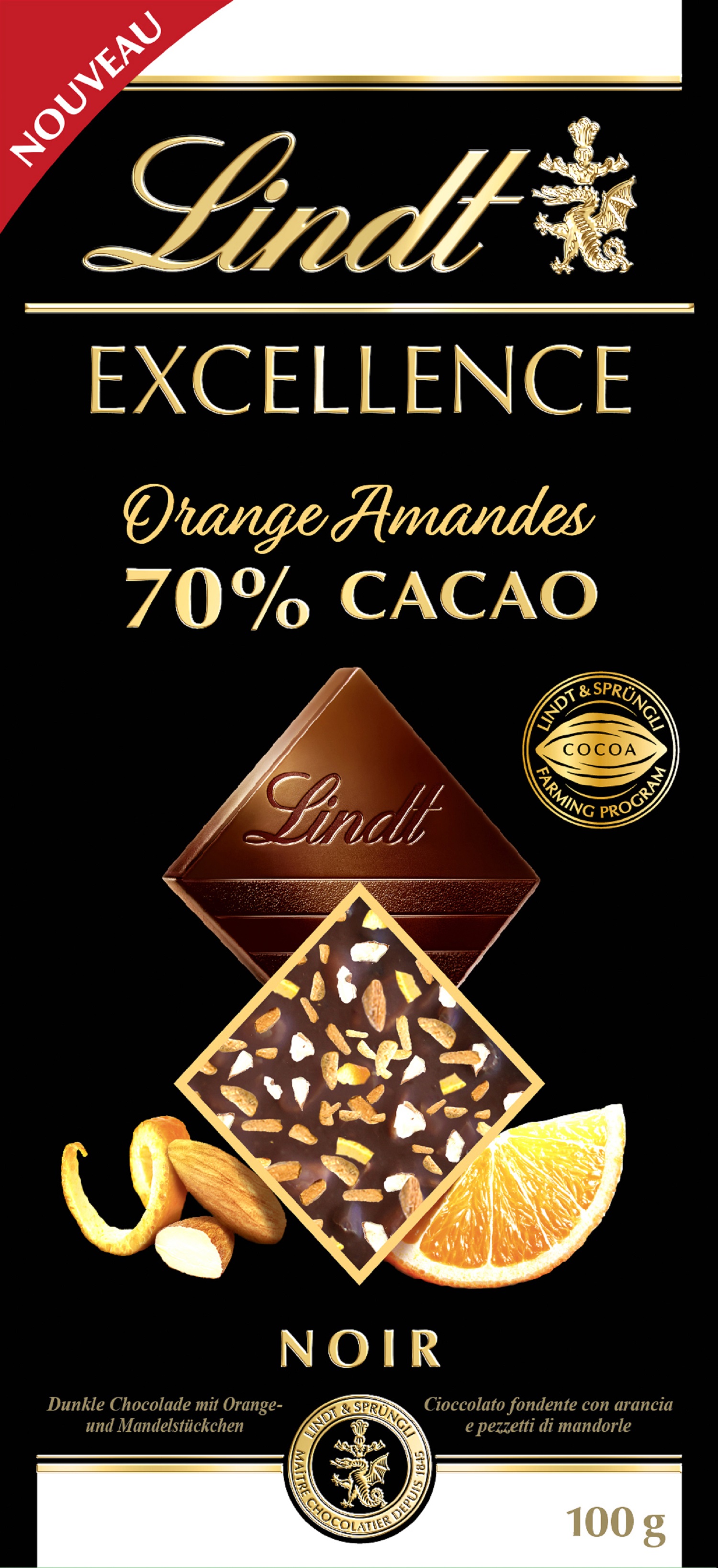 Goûtez au plaisir d'une tablette de chocolat intensément fine et gourmande avec LINDT excellence noir 70% Eclats orange amandes. L'alliance d'un fin chocolat noir à haute teneur en cacao au croquant de savoureux éclats d'amande et à la fraîcheur de l'orange. Une texture unique et authentique pour une expérience de dégustation surprenante.