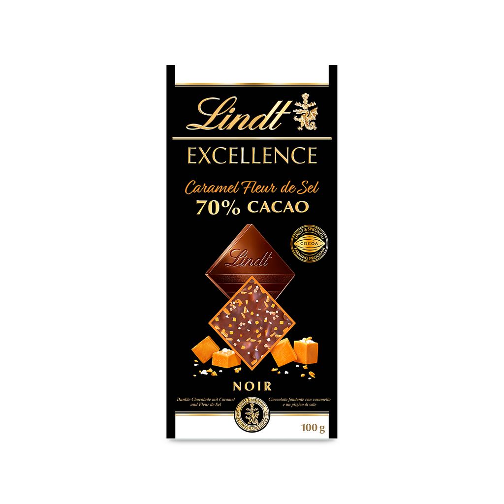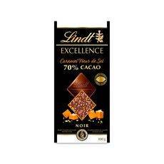 Goûtez au plaisir d'une tablette de chocolat intensément fine et gourmande avec LINDT excellence noir 70% Eclats caramel fleur de sel. L'alliance d'un fin chocolat noir à haute teneur en cacao au croquant de savoureux éclats de caramel à la fleur de sel. Une texture unique et authentique pour une expérience de dégustation surprenante.