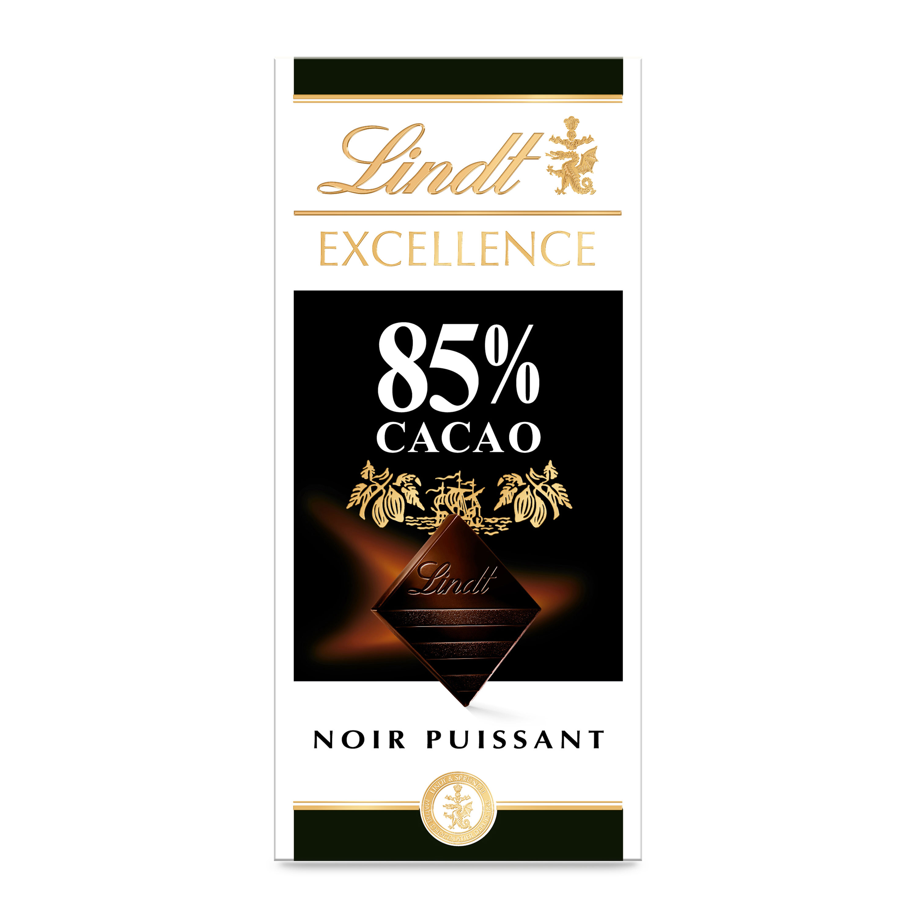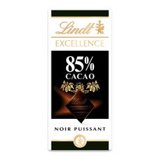 Tablette de chocolat Lindt Excellence Noir 85 % de cacao, l'intensité d'un chocolat noir premium aux puissantes notes cacaotées.